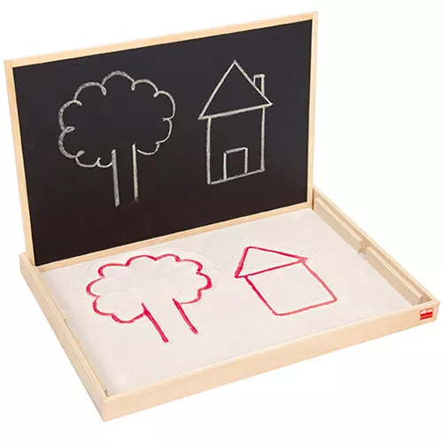Het 4-in-1 tekenbord bevat verschillende functies. Kinderen kunnen schrijven in het zand, op het krijtbord en whiteboard. Daarnaast kunnen er magneten bevestigd worden op het whiteboard. Het schrijven op verschillende ondergronden en met verschillende materialen zorgt voor sensorische ontwikkeling bij het kind.