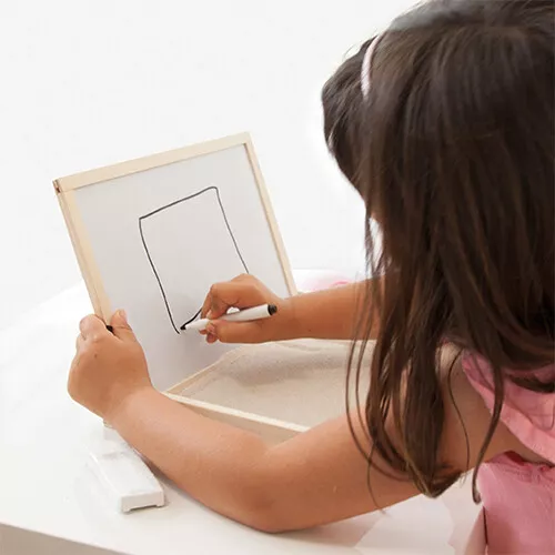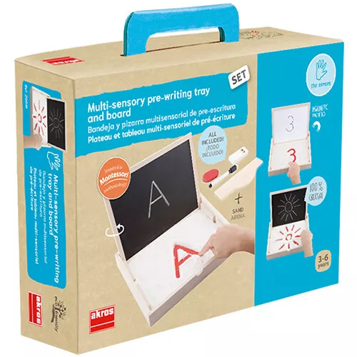 Deze ‘Bandeja multisensorial de preescritura’ van het Spaanse merk Akros is een multisensorische zand- en schrijftafel voor het ontwikkelen van onder andere de schrijfvaardigheid van kinderen. De tekentafel is geïnspireerd op de Montessori-methodologie.