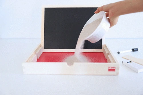 Vul bij het begin de zandbak met zand uit de bijgeleverde zak. Plaats vervolgens het schrijfbord op de steun van de zandbak, het tekenen kan beginnen! Klaar met het tekenen of schrijven? Wis de creaties makkelijk weg met de wisser of maak het zand weer glad met de bijgeleverde tool.