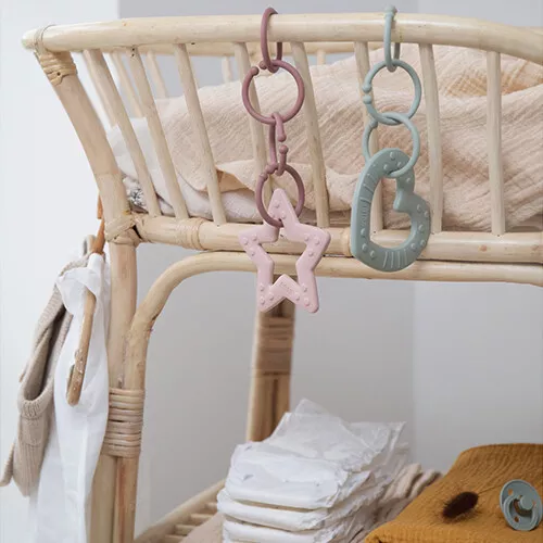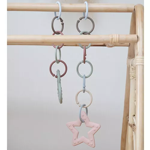 Een set van 12 ringen ‘Loops – Sand-Vanilla-Dark oak’ van het Deense merk BIBS in drie tinten. Deze veelzijdige babyringen kunnen voor enorm veel doeleinden gebruikt worden: als babyspeelgoed, als wagenspanner, als ophang mechanisme voor knuffels, als speenkoord, enzovoort!