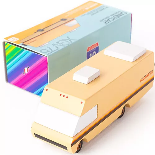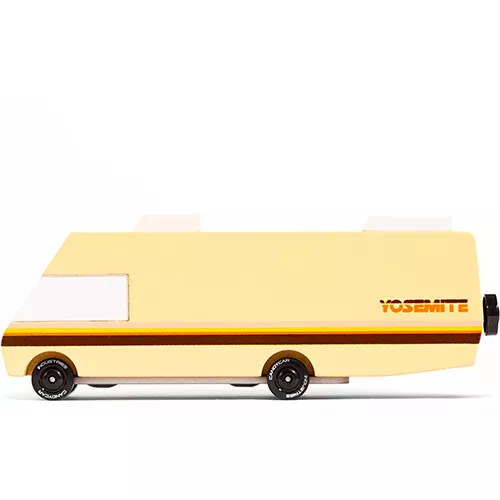 Deze speelgoedcamper ‘Yosemite RV’ van het Amerikaanse merk Candylab is favoriet voor een roadtrip. De houten wagen met lichtgele kleur en retro strepen doet door een simpel maar uiterst sterk ontwerp meteen denken aan een klassieke camper. Designerspeelgoed voor de echte autoliefhebber.