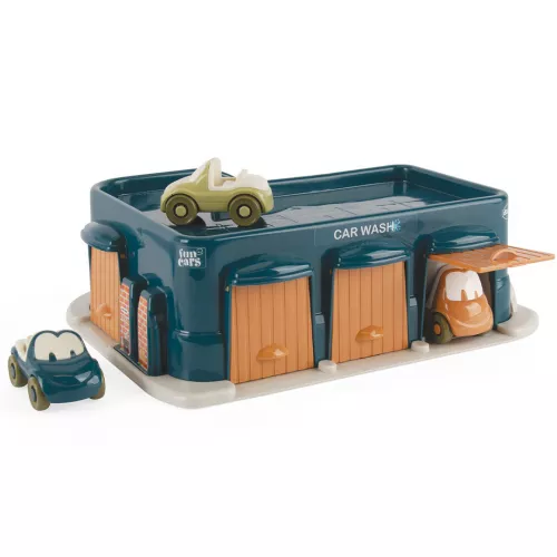 De wasstraat heeft vier garageboxen, een parkeerplaats op het dak, een slagboom en helling waar de drie bijgeleverde speelgoedauto’s vanaf kunnen rijden.