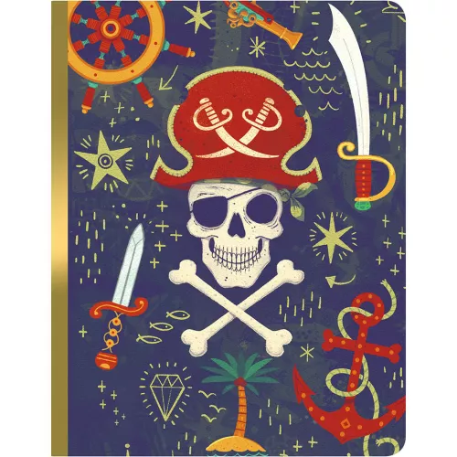 Het notitieboek met metallic gouden details heeft op de kaft piratenillustraties zoals een anker, zwaarden en doodshoofd. Op elke bladzijde heeft het schriftje een kleine illustratie.