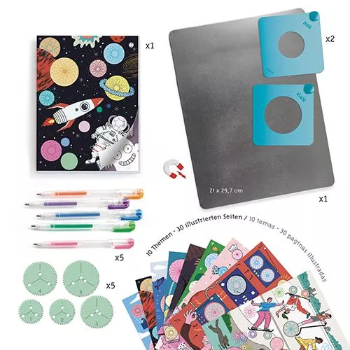 Met deze tekenset ‘Spirals – Pad Of 10 Designs’ steekt het Franse merk Djeco de klassieke activiteit spiralen tekenen in een hedendaags jasje. Met het magnetische werkblad en spiraalsjablonen van verschillende grootte verfraaien kinderen vrolijke prenten.