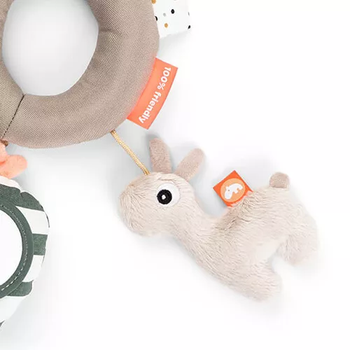 De speelgoedring bevat alles wat een nieuwsgierige baby zich kan wensen: een bijtspeeltje, kindveilig spiegeltje met rammelaar, een fluweelzacht knuffelbeestje, knisperpapier en labeltjes van verschillende grootte en textuur om aan te frummelen. Door zijn open vorm kan de baby de stoffen speelring makkelijk vastpakken.