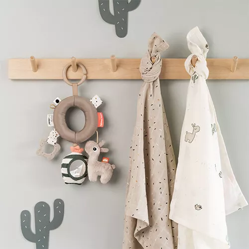 Het babyspeeltje is eenvoudig op te hangen aan de kunststof ring. Zo kan het activiteitenspeelgoed mee in de box, kinderwagen of autozitje en is vermaak altijd binnen handbereik.