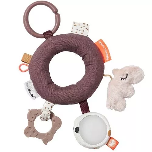 De speelgoedring bevat alles wat een nieuwsgierige baby zich kan wensen: een bijtspeeltje, kindveilig spiegeltje mèt rammelaar, een fluweelzacht knuffelbeestje, knisperpapier en labeltjes van verschillende grootte en textuur om aan te frummelen. Door zijn open vorm kan de baby de stoffen speelring makkelijk vastpakken.