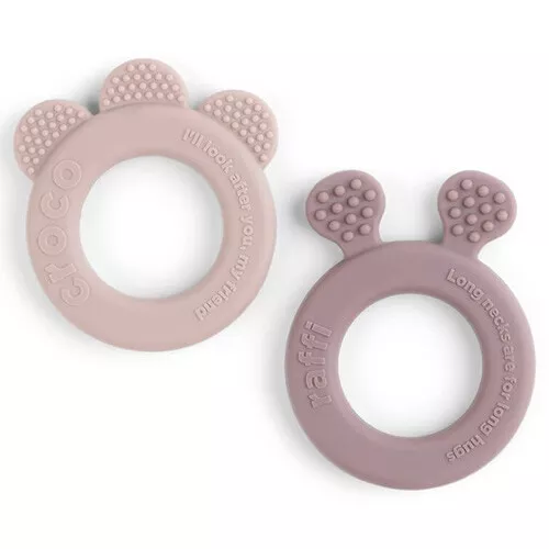 Om de pijn bij doorkomende tandjes iets te verzachten is het fijn voor baby’s om te bijten en te sabbelen op deze siliconen bijtring ‘Teether 2-Pack – Deer Friends – Powder’ van het Deense merk Done By Deer.