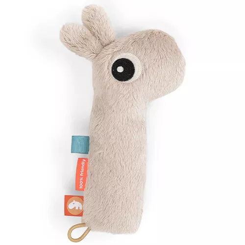 Deze rammelaar ‘Squeaker Rattle – Lalee/Sand’ van het Deense merk Done by Deer heeft een vrolijk rammeltje en maakt een grappig piepgeluid wanneer de baby erin knijpt. Met zijn lange nek is de knijprammelaar makkelijk vast te pakken. De verschillende texturen van de labeltjes bieden extra plezier.