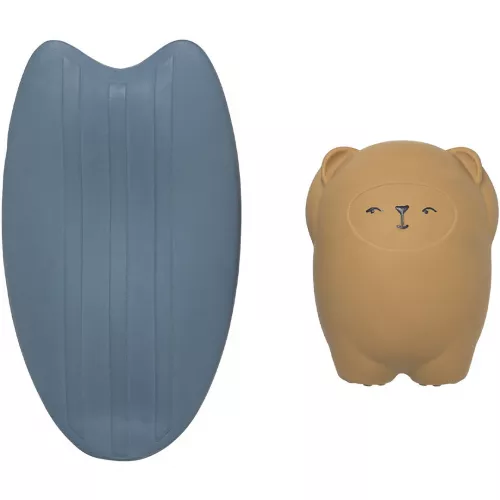 Het babyspeelgoed bestaat uit een bruine, kleine beer en een blauw surfboard. De speeltjes zijn gemakkelijk vast te pakken door kleine handjes, waardoor het perfect is om in te knijpen of bijten. Het badspeelgoed heeft geen luchtgaatje, waardoor er geen water in het speelgoed komt. Er is dus geen ruimte voor zeepresten.Â