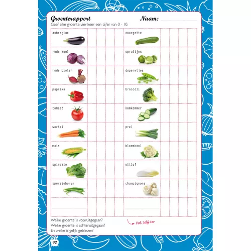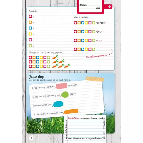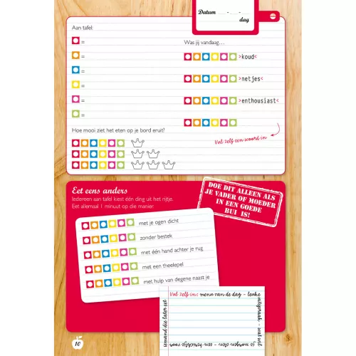 Op elke pagina is invulruimte voor zes eters aan tafel. Hoeveel sterren geef jij de smaak van het eten? Hoeveel pluimen geef jij de kok? Hoe lief was jij vandaag? Eet één minuut met één hand achter je rug. Wat ruikt niet lekker, maar smaakt wel lekker? Wie van jullie heeft vandaag de meeste trappen gelopen? Wat had jij vandaag over willen slaan? En ook: cursus tafelmanieren en voor iedereen een groenterapport.