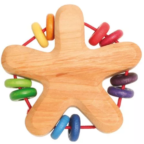 Een houten rammelaar met mooie afgeronde randen en 10 gekleurde houten schijfjes ‘Rassel Stern’ van het Duitse merk Grimm’s.