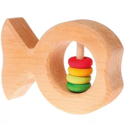 Een houten rammelaar met de omtrek van een vis van het Duitse merk Grimm’s. De rammelaar is licht en makkelijk te pakken. De gekleurde schijfjes maken een zacht rammelend geluid.