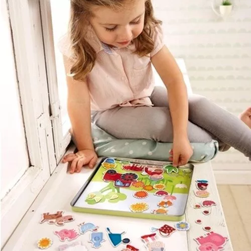 Deze speelgoedset bevat vier achtergronden en 122 magneten waarmee steeds weer andere verhalen verteld worden. Een afgemaakte kaart kan ook als schilderij of achtergronddecor in de kinderkamer dienen.