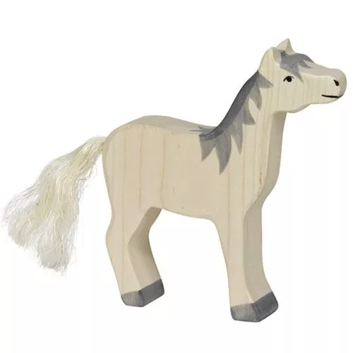 Een klein houten paard met grijze manen en een staart van touw uit de boerderijserie van het Duitse merk Holztiger. Dit speelgoedpaard met afgeronde hoeken ligt prettig in kinderhanden.