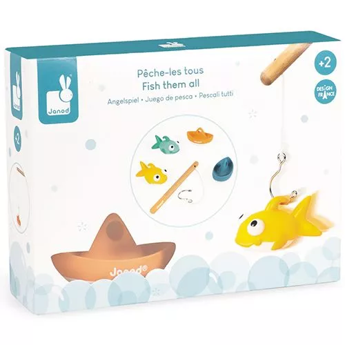Een kleurrijk hengelspel van het Franse merk Janod om mee in het bad te spelen. Lukt het om alle visjes en bootjes te vangen?