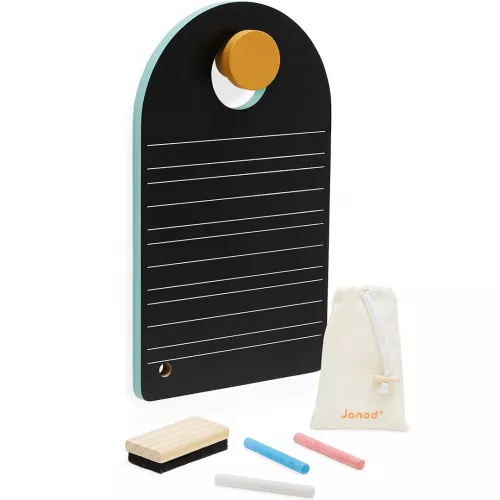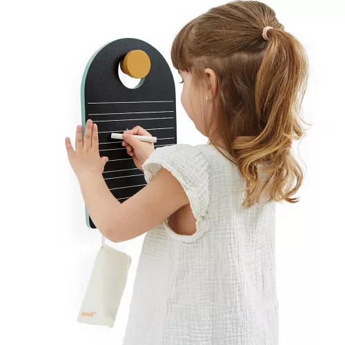 Een handzaam, dubbelzijdig houten schoolbord van het Franse merk Janod om in verschillende plekken in het huis of onderweg te tekenen en schrijven.