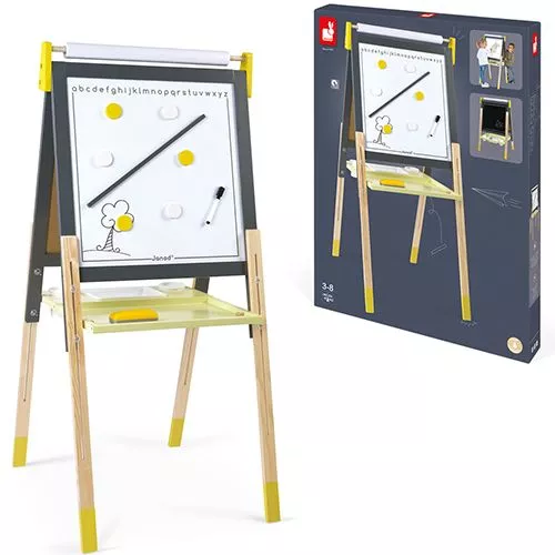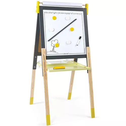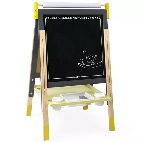 Een dubbelzijdig houten school- en magneetbord met verstelbare poten van het Franse merk Janod in geel en grijs. Het speelgoedschoolbord heeft aan de ene zijde een zwart krijtbord en aan de andere zijde een magneetbord/whiteboard. Boven het bord hangt een rol tekenpapier en onder de borden een plank voor krijtjes en magneten.