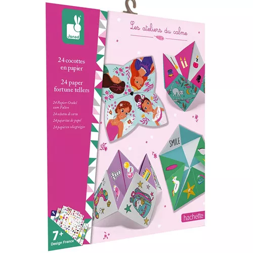 Happertjes of papieren waarzeggers, wie kent ze niet? Met de vouwset ‘Cocottes en Papier’ van het Franse merk Janod kunnen kinderen hun eigen happertjes vouwen en versieren. Met 24 verschillende dessins is er genoeg te kiezen.