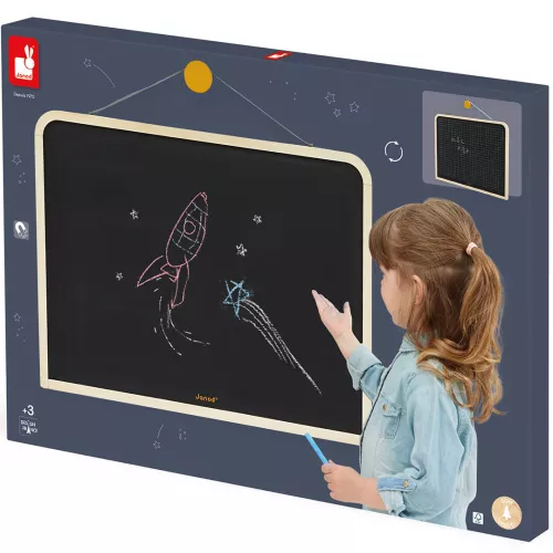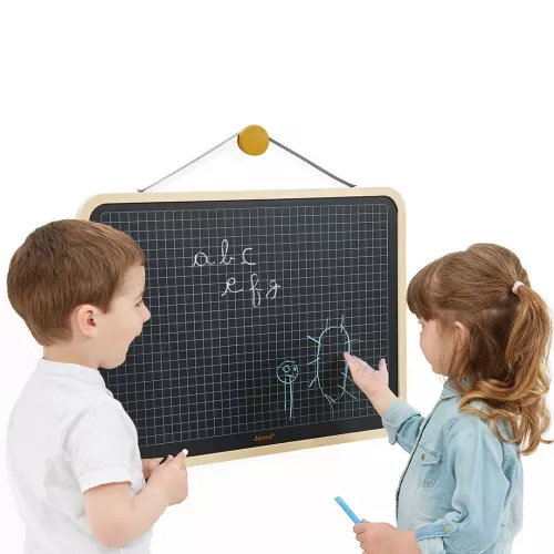 Een praktisch dubbelzijdig houten schoolbord om op te hangen van het Franse merk Janod met aan de ene zijde een blanco schoolbord en aan de andere zijde ruitjes.