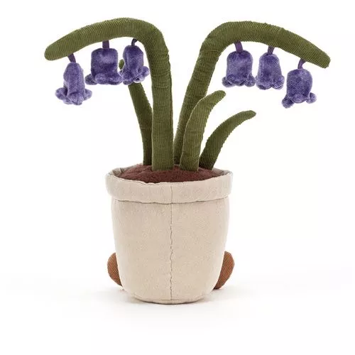 ‘Amuseable Bluebell’ van het Engelse merk Jellycat is een fleurige knuffelbloem in een canvas potje. Met de vertederende glimlach, corduroy beentjes en zwarte kraaloogjes is het haast onmogelijk om niet verliefd te worden op dit knuffelbolgewas. Uit de bruine, pluche aarde steken vijf groene, corduroy stengels, waarvan er twee zijn versierd met paarse klokjes.