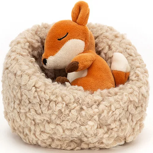 Dit slaperige vossenjong is een klein knuffeltje voor de allerkleinsten. ‘Hibernating Fox’ van het Engelse merk Jellycat is met zijn wollige teddy mandje klaar voor een diepe winterslaap, maar voor een knuffel wil hij af en toe wel uit zijn nestje komen.