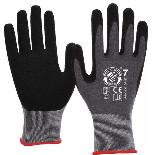 Een paar beschermende werkhandschoenen maat 8/L voor de leeftijd van 8-11 jaar uit de serie Kids-at-Work van het Duitse speelgoedmerk Corvus.