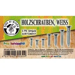Een doosje van kunststof met 175 stuks zilverkleurige houtschroeven uit de serie Kids-at-Work van het Duitse speelgoedmerk Corvus.