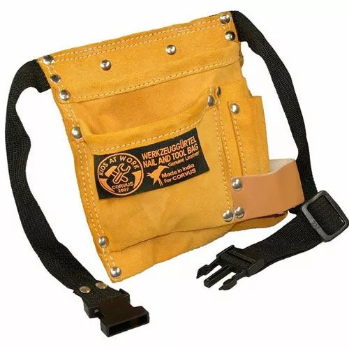 Met deze stoere, leren – lege – gereedschapsgordel uit de serie Kids-at-Work van het Duitse speelgoedmerk Corvus kan een kleine klusser zelf zijn gereedschap samenstellen om mee te nemen bij zijn klussen.
