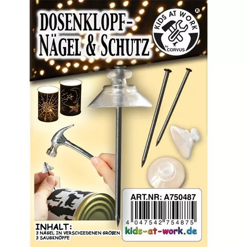 Drie spijkers en drie beschermende hoedjes om de blikken nachtlantaarns uit de serie Kids at Work van het Duitse speelgoedmerk Corvus mee te versieren.