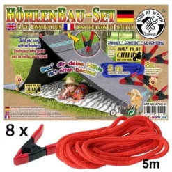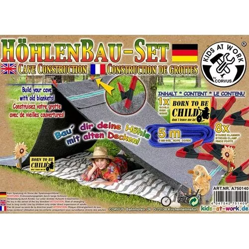 Zelf een tent in de tuin bouwen? Dan heb je deze stevige klemmen en touw nodig uit de serie Kids-at-Work van het Duitse merk Corvus.