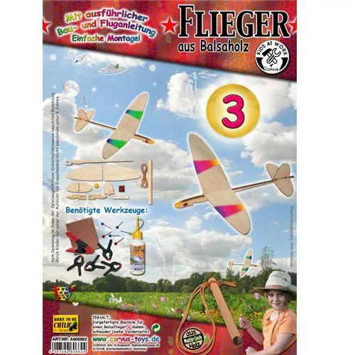 Een houten zelfbouw vliegtuigje katapult nr. 3 uit de serie Kids-at-Work van het Duitse speelgoedmerk Corvus. En dan vliegen maar!