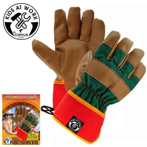 Met deze werkhandschoenen voor 8-10 jaar uit de serie Kids-at-Work van het Duitse speelgoedmerk Corvus zijn de kinderhandjes goed beschermd bij het klussen, knutselen of het tuinieren.
