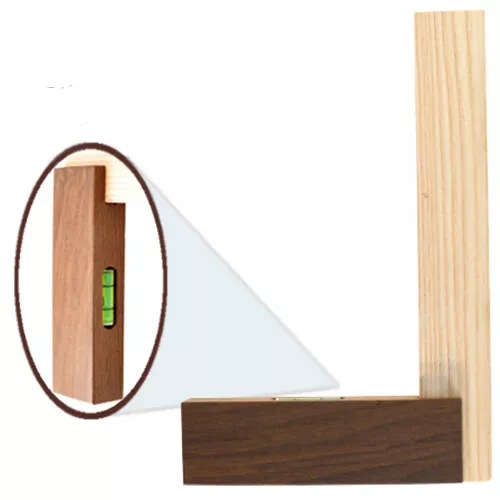 Een houten winkelhaak en waterpas uit de serie Kids-at-Work van het Duitse merk Corvus. Kindergereedschap waarmee rechte hoeken uitgezet kunnen worden èn oppervlakken waterpas gemaakt.