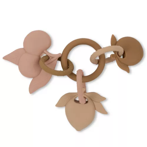 Om de pijn bij doorkomende tandjes wat te verzachten is het prettig om te bijten en te sabbelen op deze siliconen bijtring ‘Silicone Fruit Ring – Rosy Mix’ van het Deense merk Konges Sløjd.