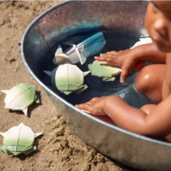 Het bijtspeelgoed en activiteitenspeeltje bestaat uit dries stuks fruit bevestigd aan een ring. De ring en bladeren van ieder bijtspeeltje zijn voorzien van verschillende vormen en texturen. Dat voelt interessant aan en masseert tegelijk het tandvlees.