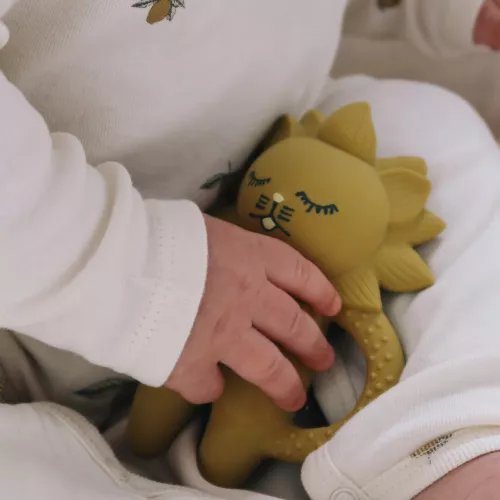 Een zachte bijtring ‘Lion – Mustard’ van het Deense merk Konges Sløjd, gemaakt van 100% natuurlijk rubber. Het babyspeelgoed past makkelijk in kleine handen en stimuleert de zintuigen.