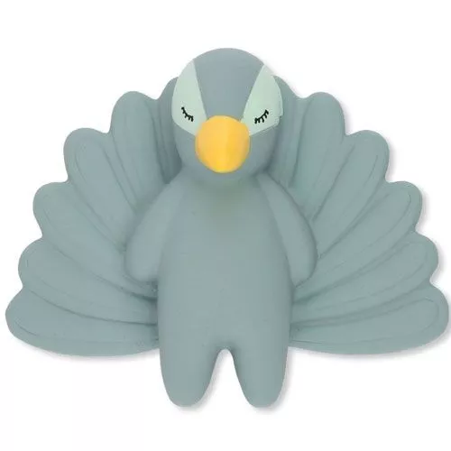 Een ‘Teeth Soother Peacock’ van het Deense merk Konges Sløjd, gemaakt van 100% natuurlijk rubber. Het grijsblauwe bijtspeeltje met een opvallend geel neusje past makkelijk in kleine handen. Babyspeelgoed dat de zintuigen stimuleert.