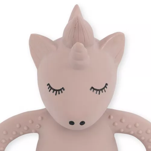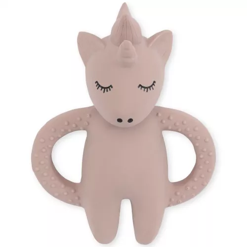 Een zachte bijtring ‘Unicorn – Rose’ van het Deense merk Konges Sløjd, gemaakt van 100% natuurlijk rubber. Het babyspeelgoed past makkelijk in kleine handjes en stimuleert de zintuigen.