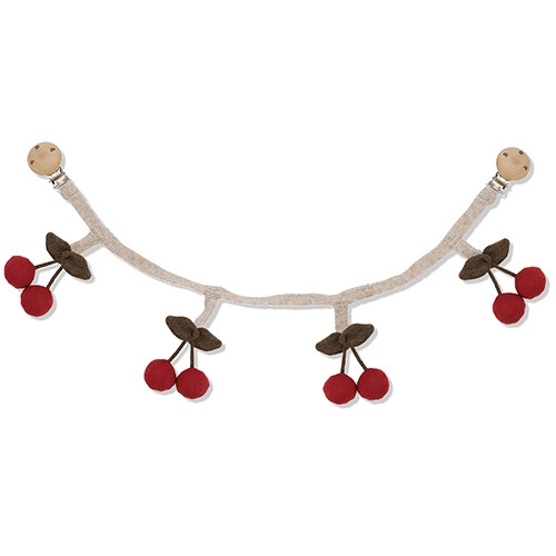 Een stoffen wagenspanner ‘Pram Chain Cherry’ van het Deense merk Konges Sløjd. Deze zachte wagenspanner met rode kersen is een speelse afleiding voor de baby in de kinderwagen of in de box.