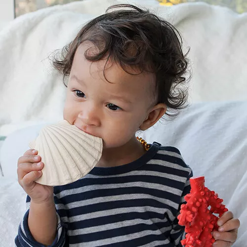 Het bijtspeeltje ‘Schelp Plat’ van het Spaanse merk Lanco Toys is prettig bij het doorkomen van de tandjes. Het reliëf op het babyspeelgoed masseert het tandvlees bij het bijten.