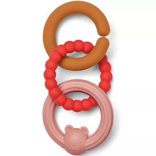 Tijdens een ritje in de kinderwagen vermaakt de baby zich met deze siliconen bijtringen ‘Anton Pram Chain – Dusty Raspberry Multi Mix’ van het Deense merk Liewood.