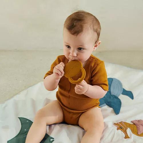 Een siliconen bijtring ‘Gemma Teether – Cat – Golden Caramel’ van het Deense merk Liewood, met verschillende rondingen en een poezensnuitje waarop gekauwd kan worden. De reliëfs van het bijtspeelgoed masseren het tandvlees. Dat verzacht de pijn van doorkomende tandjes.