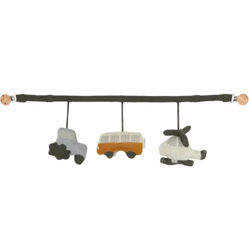 Met drie knuffeltjes in de vorm van een trekker, bus en helikopter voor de baby om onderweg te bewonderen.