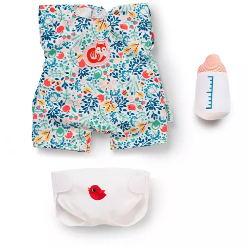 De speelgoedset bestaat uit de knuffelpop, een pakje met Alice de vos, een luier en een flesje. De poppenkleren kunnen gemakkelijk aan- en uitgetrokken worden.
