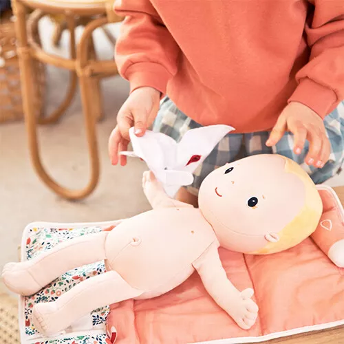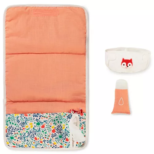 De babypop kan eenvoudig verschoond worden met deze poppenverzorgingsset ‘Flowers’ van het Belgische merk Lilliputiens. De speelgoedset bestaat uit een verschoonmatje, luier, tube zalf en een babydoekje.
