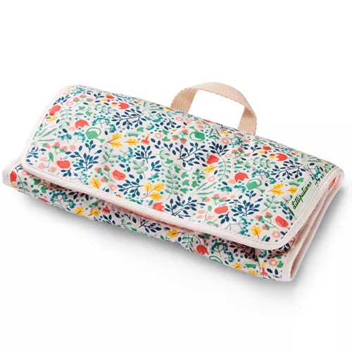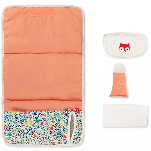 Het opvouwbare verschoonmatje sluit met klittenband en is voorzien van vakjes om de accessoires in op te bergen.