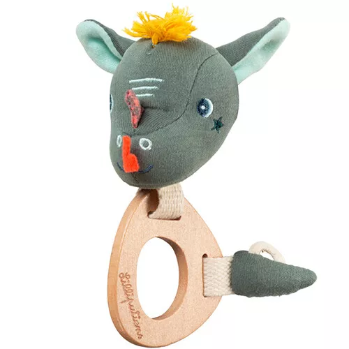 Het babyspeelgoed is aan de houten bijtring gemakkelijk vast te pakken en stimuleert, de tastzin, de fijne motoriek en het gehoor.