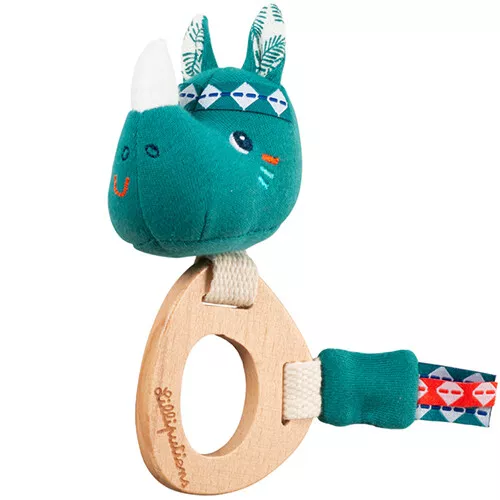 Wanneer baby’s hem heen en weer schudden, laat rammelaar Marius van het Belgische merk Lilliputiens zijn zachte belletje horen. Onder het neushoornsnuitje is een houten bijtring bevestigd die de pijn van doorkomende tandjes helpt te verzachten.