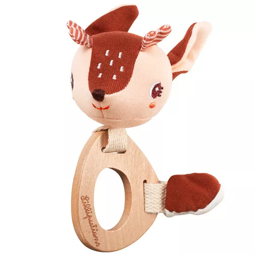 Wanneer baby’s haar heen en weer schudden, laat rammelaar Stella van het Belgische merk Lilliputiens haar zachte belletje horen. Onder het hertje is een houten bijtring bevestigd die de pijn van doorkomende tandjes helpt te verzachten.